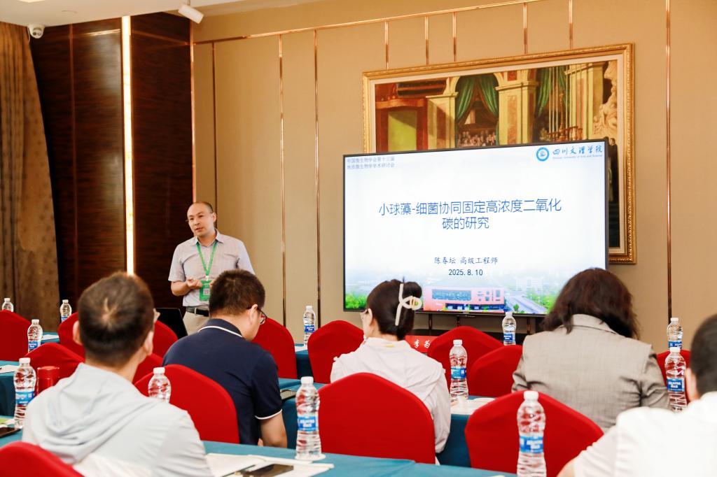 公司陈春坛教师参加了会议,并在分会场作题为“小球藻-细菌协同固定高浓度二氧化碳的研究”的专题报告。报告系统阐述了小球藻与功能细菌的共生固碳机制,深入分析了协同体系对高浓度CO₂的固定效率、影响因素及代谢调控策略,并展示了该技术在工业尾气处理与低碳转化领域的应用前景。报告内容因其创新性、科学性及实践价值,获得了参会专家学者的广泛关注与高度评价。