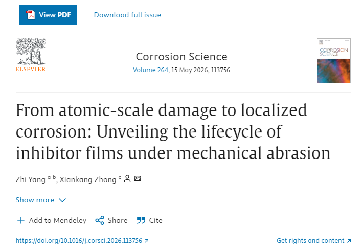 近日,我院杨志副教授以第一作者身份在国际腐蚀领域顶级期刊《Corrosion Science》(中科院一区,影响因子8.5)上发表最新研究成果“From atomic-scale damage to localized corrosion: Unveiling the lifecycle of inhibitor films under mechanical abrasion”,qy太阳成集团tyc122ccvip为该成果第一完成单位。论文链接:https://doi.org/10.1016/j.corsci.2026.113756.