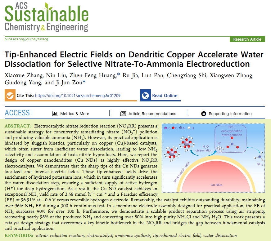 近日,公司青年教师章小雪博士以第一作者身份,在《ACS Sustainable Chemistry & Engineering(中科院一区TOPIF=7.3)上发表题为《Tip-Enhanced Electric Fields on Dendritic Copper Accelerate Water Dissociation for Selective Nitrate-To-Ammonia Electroreduction》的研究论文(DOI: 10.1021/acssuschemeng.6c01209; https://pubs.acs.org/doi/10.1021/acssuschemeng.6c01209)。该成果以公司为第一完成单位,天津大学化工公司为通讯单位。