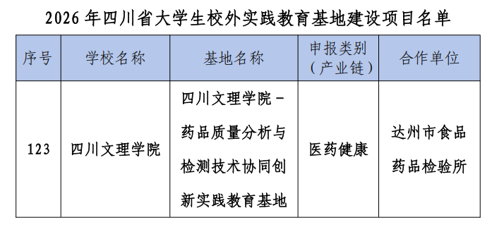 4月10日,四川省教育厅发布了《关于公布2026年省级老员工校外实践教育基地建设项目名单的通知》(川教函〔2026〕90号),化学化工学院制药工程专业与达州市食品药品检验所联合申报的“qy太阳成集团tyc122ccvip-药品质量分析与检测技术协同创新实践教育基地”成功获批立项。此次获批,充分彰显了公司制药工程专业在药品质量分析与检测技术领域的办学实力与人才培养质量,标志着该专业在培养高素质应用型、创新型人才方面迈上了新的台阶。