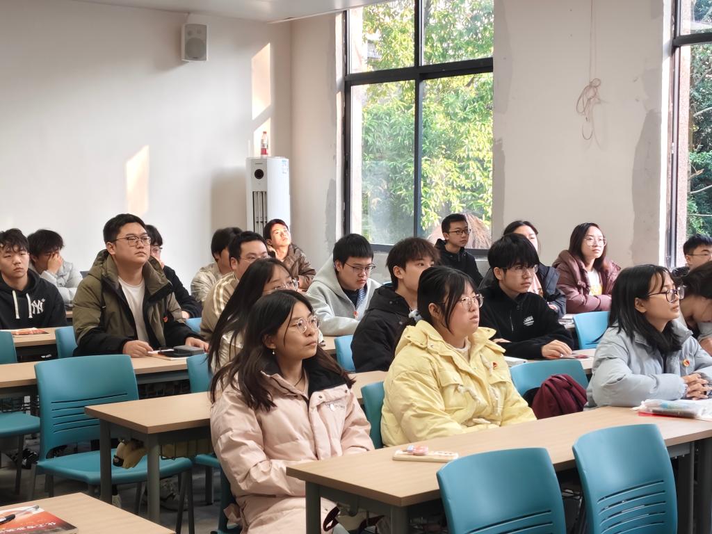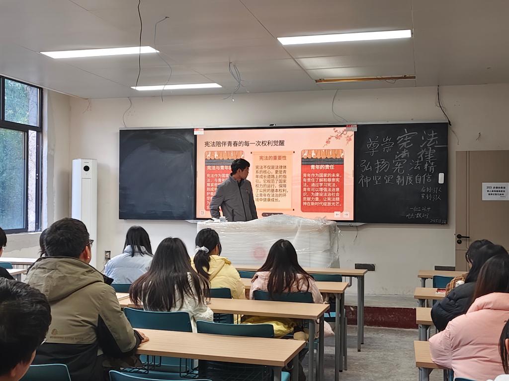活动伊始,各团支书带领全体同学齐唱团歌,拉开了团课序幕。紧接着,各团支书通过播放宪法宣传视频、展示图文资料等方式,系统讲解了宪法的根本法地位、基本特征及其重要作用,并重点回顾了我国宪法的发展历程。团支书在讲解中强调,结合新时代法治建设要求,青年应该把制度自信转化为奋进动力,用实际行动守护宪法权威,在青春赛道上践行法治信仰。在交流分享环节,同学们踊跃发言,畅谈学习体会,并纷纷表示,作为当代新青年,更应该主动学习宪法,自觉遵守宪法法律,积极弘扬宪法精神,为法治社会建设贡献力量。