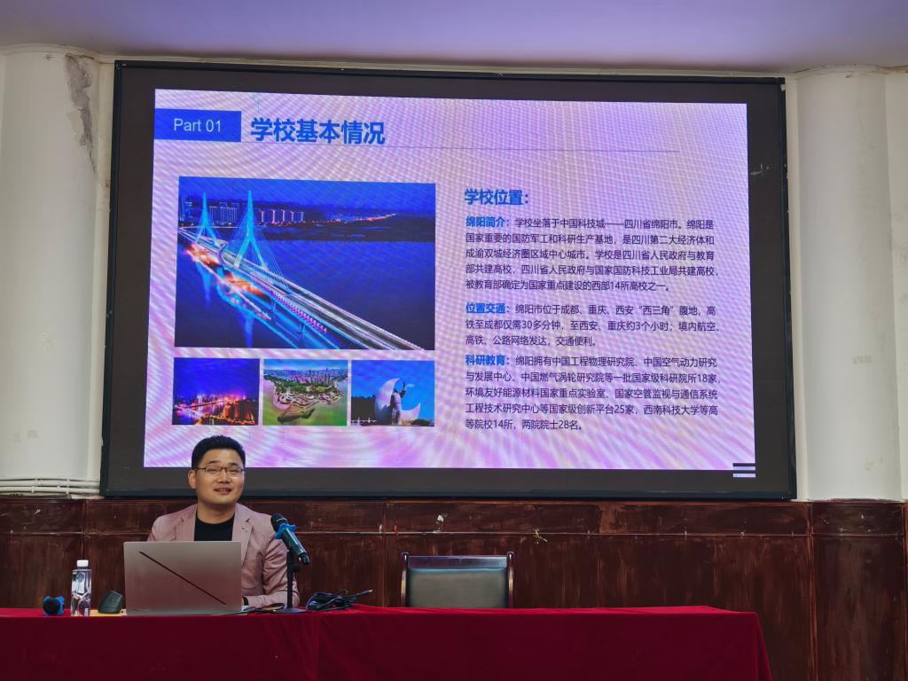 活动伊始,陈春坛主任对陈涛教授的到来表示热烈欢迎。随后,陈涛教授详细介绍了西南科技大学与国防科技公司的整体概况、团队力量、科研平台与招生政策。针对招生细则,陈教授解读了招生方向、考试科目及调剂政策,重点阐述了相关专业的特色优势及完善的奖助体系。