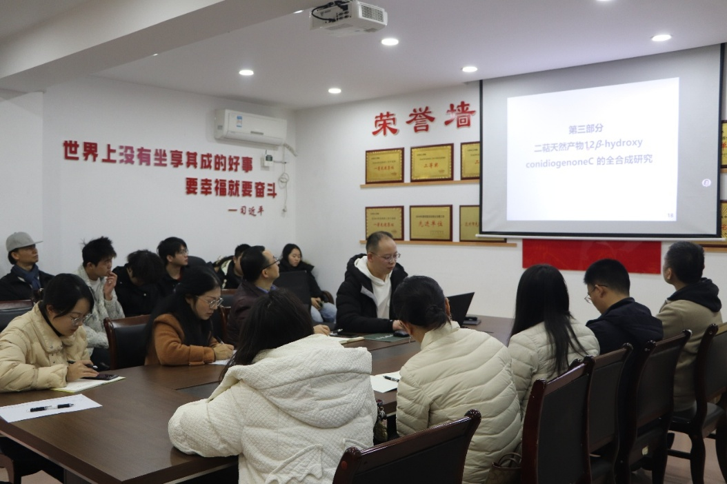 李甜博士作了题为“天然产物Cyclopianes二萜的不对称全合成和抗炎机制研究”的学术报告,系统介绍了天然产物conidiogenone C、K及12β-hydroxy conidiogenone C的不对称全合成工作。研究以Pauson-Khand反应、金催化酰氧基1,3-迁移与Nazarov环化的串联反应为关键策略,高效构建了目标产物的核心骨架,并发展了一种高立体选择性合成环戊烯酮的新方法。该工作为相关天然产物的药物开发与作用机制研究提供了重要的理论支撑。